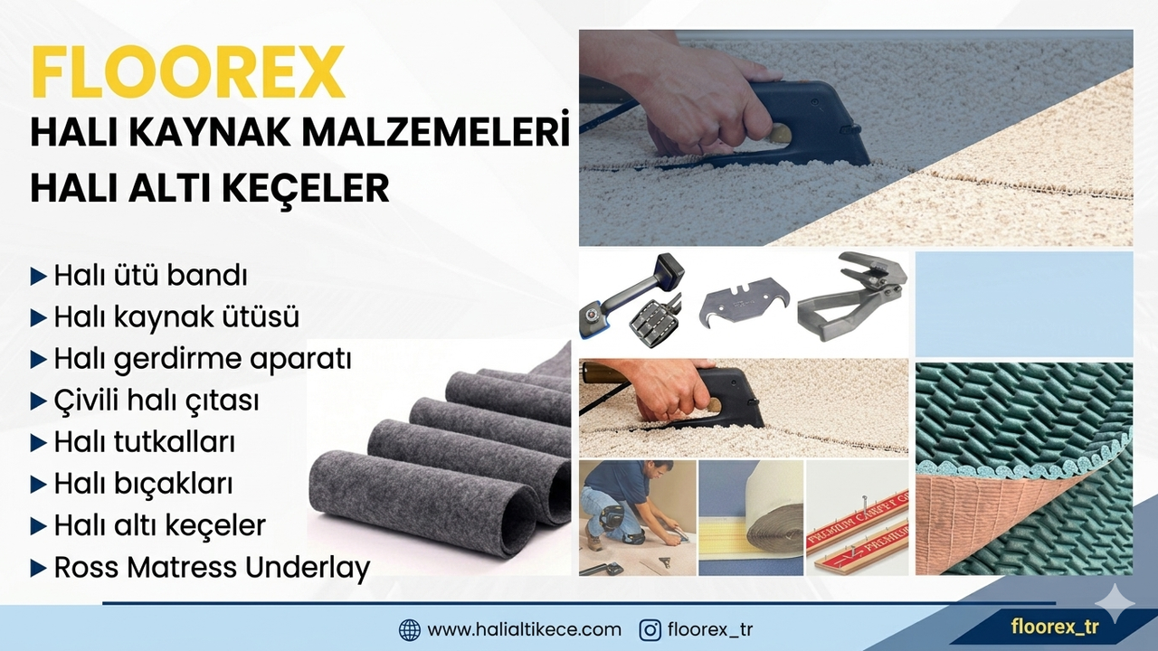 Siz de zeminlerinizde maksimum konfor, yüksek yalıtım ve kusursuz bir görünüm arıyorsanız, carpet underlay,halı ütü bandı ve uzman montaj ekipmanları Floorex halı kaynak malzemeleri ile projelerinizi bir üst seviyeye taşıyabilirsiniz.
